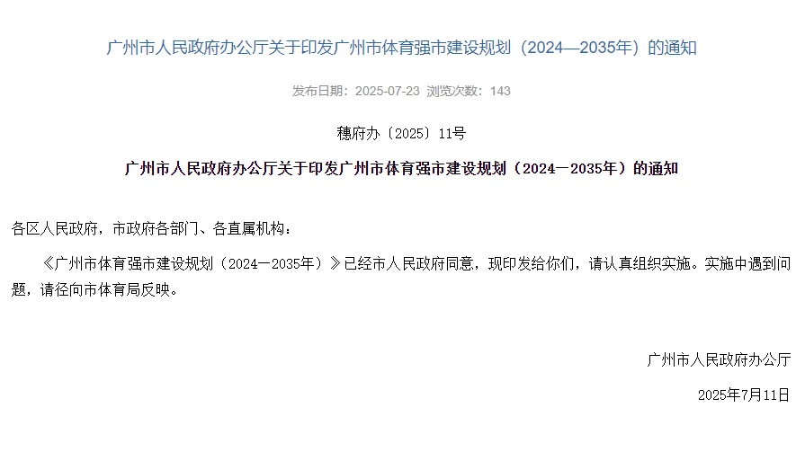 值得一提的是,去年7月23日,《广州市体育强市建设规划(2024-2035年)》正式印发。